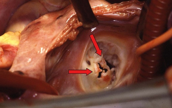 Mais la cause la plus commune des maladies de la valve aortique, est la calcification de la valve. Au fil des années, une dégénérescence valvulaire peut être observée chez le sujet âgé, l’anneau et les feuillets de valve deviennent sclérosés et calcifiés. Il en résulte une diminution du diamètre de l‘ouverture de la valve, ce que l‘on appelle sténose aortique.